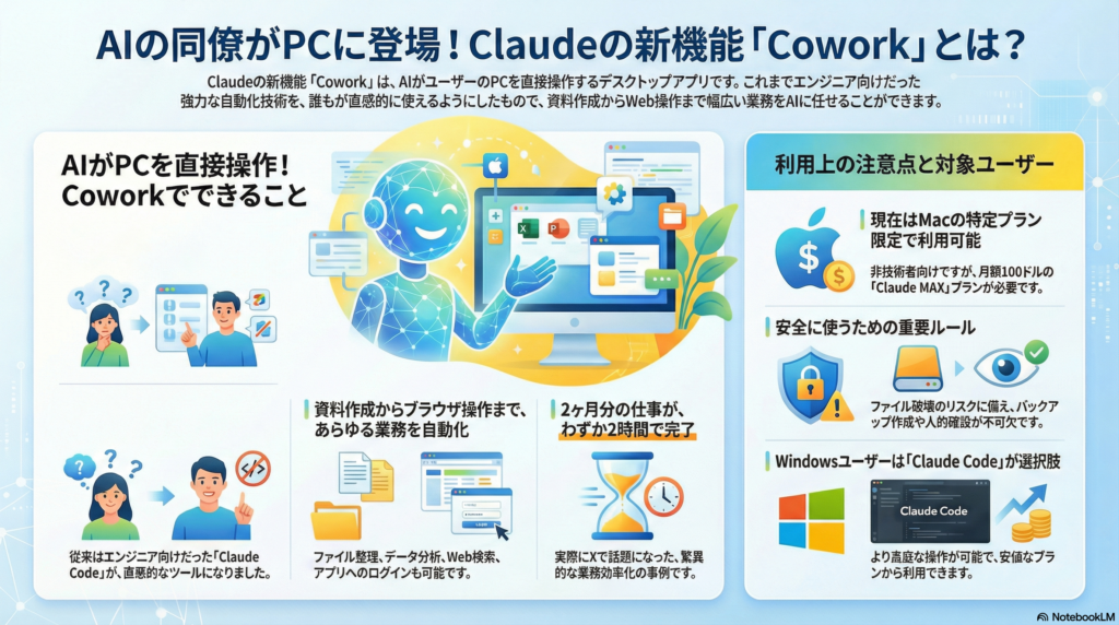 このように、PCの深い階層までアクセスできるCoworkの強力さは、同時に慎重な取り扱いを求めるものであり、安全な利用に向けた理解が不可欠となります。