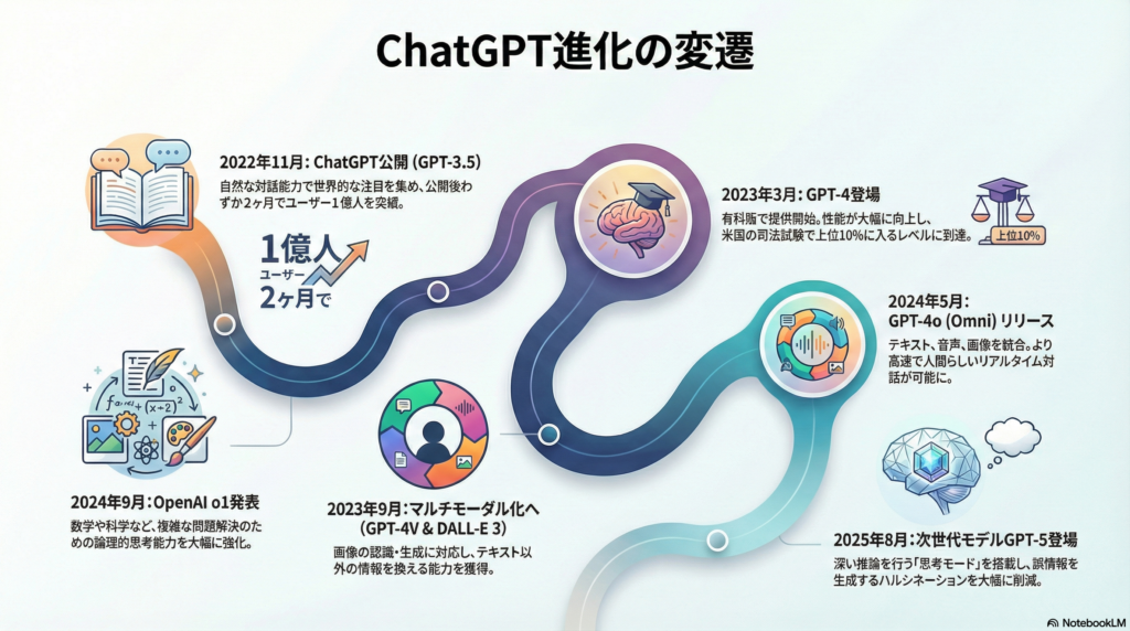 この記事では、対話型生成AIの代表格であるChatGPTが、どのような技術的変遷を辿り、私たちの社会にどのような影響を与えてきたのかを詳しく解説します。2022年の衝撃的なデビューから、最新の高度な推論モデルに至るまでの進化の過程を振り返り、その背景にある仕組みや直面している課題について分かりやすくお伝えします。