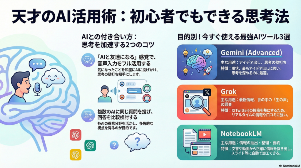 現在、無料で使えるものも含めて多くの優れたAIツールが存在しますが、初心者がまず注目すべきは、Googleが提供するジェミニや、特定の情報源に強いノートブックLMです。さらに、SNS上の生の声を拾いたい場合にはグロックというツールも非常に有効です。これらのツールを同時に立ち上げ、同じ悩みや質問を投げかけてみることをお勧めします。