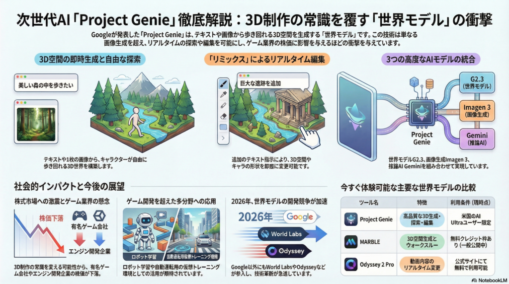 近年、人工知能の進化は目覚ましく、文章や画像から全く新しい三次元空間を構築し、その中を自由に歩き回れる技術が登場しました。本記事では、Googleが公開した革新的な「世界モデル」であるProject Genieを中心に、その特徴や社会への影響、そして同様の体験ができる最新ツールについて詳しく解説します。