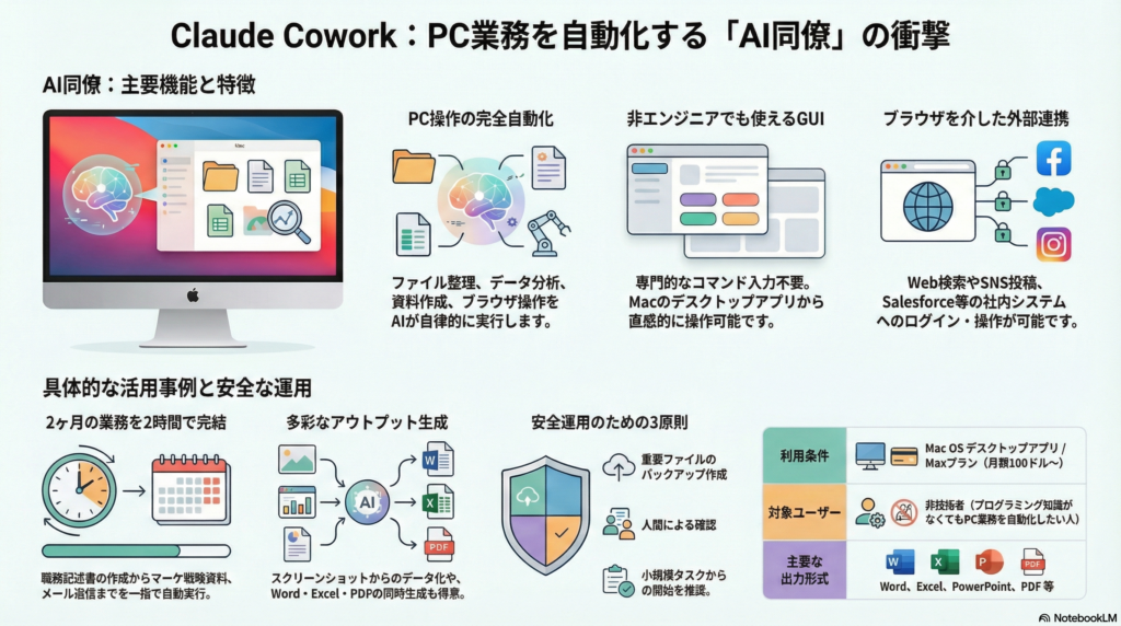 もともと、エンジニア向けに提供されていた「Claude Code」という強力な自動化ツールがありましたが、それは専門的な知識が必要なものでした。Coworkは、その高度な機能を専門家以外の人でも直感的に使えるように設計されたサービスです。画面上のボタン操作や日本語での指示だけで、パソコン内の複雑な作業をAIに任せることができるようになっています。