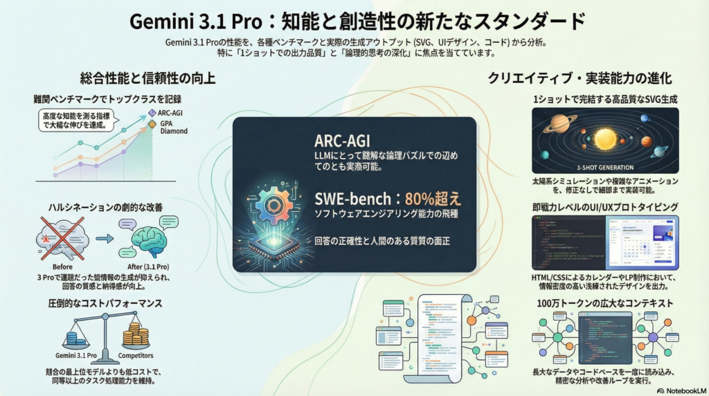 本記事では、新たに公開されたAIモデルであるGemini 3.1 Proの性能や特徴について詳しく解説します。ベンチマーク結果の分析から、コーディングやデザイン、文章作成における具体的な実用性まで、最新モデルがどのような進化を遂げたのかを多角的な視点でまとめています。