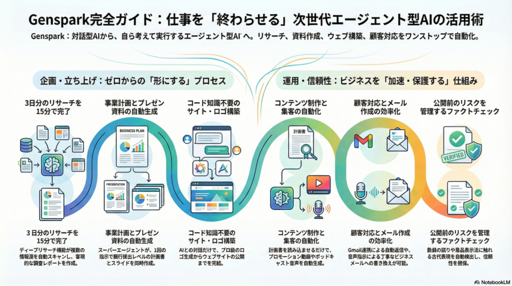 このように、Gensparkは市場調査から計画策定、デザイン、開発、集客、そして運営の自動化に至るまで、ビジネスのあらゆるフェーズを強力にバックアップします。個別のAIツールを使い分ける手間から解放され、一つの統合されたプラットフォームを活用することで、最小限の投資で最大限の成果を生み出すことが可能になります。AIを単なる相談相手としてではなく、実務を遂行するパートナーとして導入することは、これからの効率的な働き方を実現するための重要な鍵となるでしょう。
