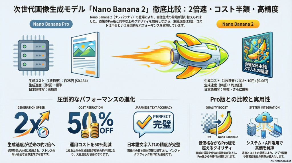 本記事では、新たに登場した画像生成モデル「Nano Banana 2」について、その処理速度、コストパフォーマンス、および生成品質の観点から、従来モデルとの比較を交えて詳細に解説します。