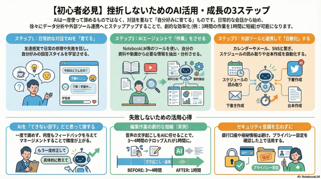 最終的には、特定の専門分野における作業時間を短縮するためにAIを導入することが目標となります。音声やテキストの処理能力を活かせば、これまで多大な時間を費やしてきた作業を数分の一に短縮することが可能です。例えば、インタビューや会議の録音データをAIに解析させ、発言内容を正確に文字に起こした上で、その要約や議事録の構成案を作成させることができます。以前は録音を聞き返しながら数時間かけて行っていた書き起こし作業も、AIを活用すれば短時間でベースが出来上がります。こうした成功体験を積み重ねることで、AIを単なる便利な道具としてだけでなく、自身の能力を拡張するパートナーとして使いこなせるようになります。
