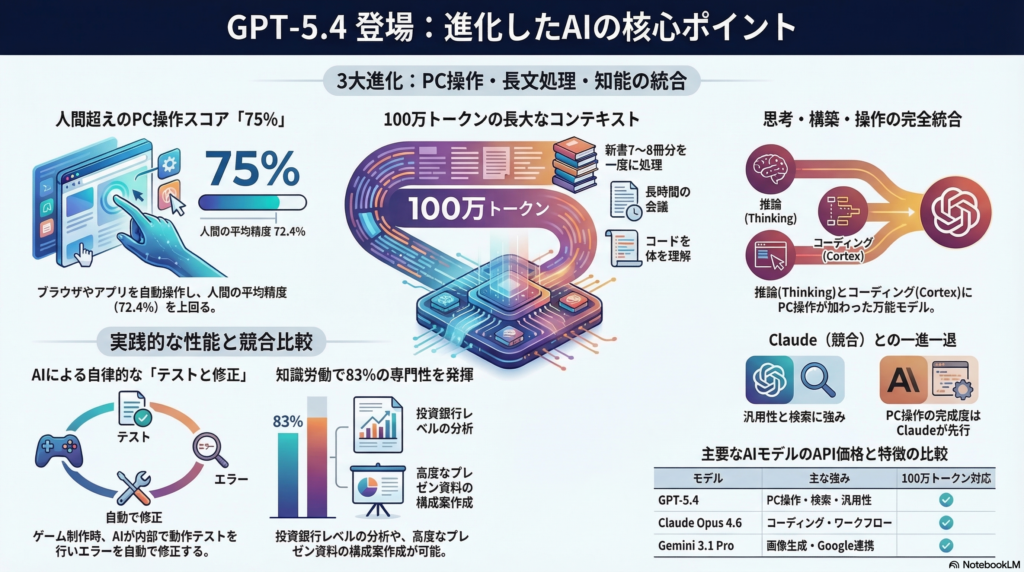 本記事では、OpenAIから新たに発表されたAIモデルであるGPT-5.4の主な機能、技術的な進化、そして他の主要なAIモデルとの性能比較について詳しく解説します。GPT-5.4は、従来の推論能力やコーディング能力を統合しつつ、新たにコンピュータの直接操作機能を搭載したモデルとして位置づけられています。