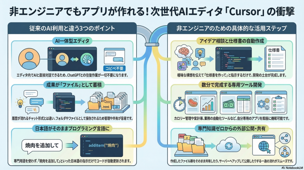 本記事は、生成AIを統合した次世代のコードエディタである「Cursor」の基本的な特徴と、プログラミング経験が少ない方でも活用できる具体的な方法についてまとめたものです。従来のAIツールとの違いや、日々の業務を効率化するための視点について詳しく解説します。
